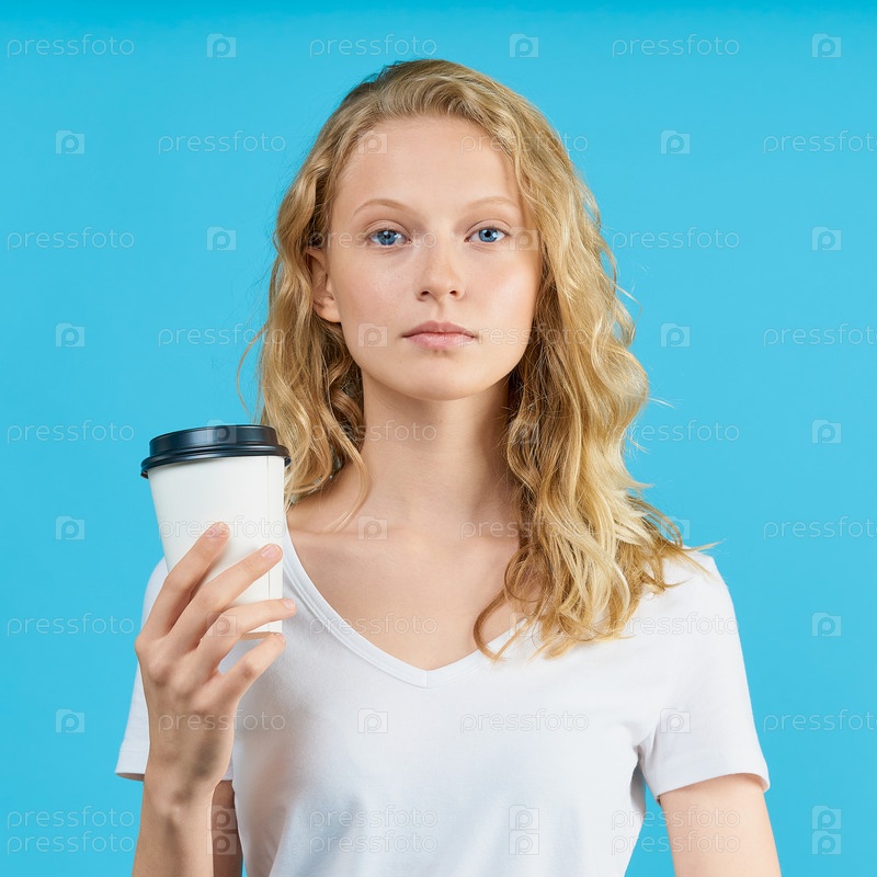 Портрет молодой студентки с чашкой кофе на цветной ярко-синей стене