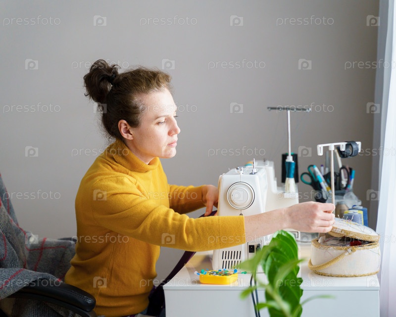 Женщина-швея с помощью швейной машины во время работы дома
