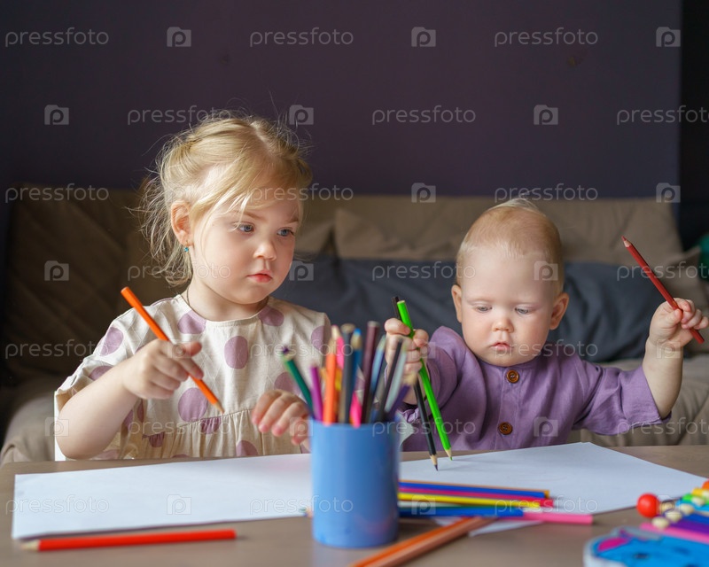 Двое детей, сестра и маленький брат, рисуют карандашами вместе дома