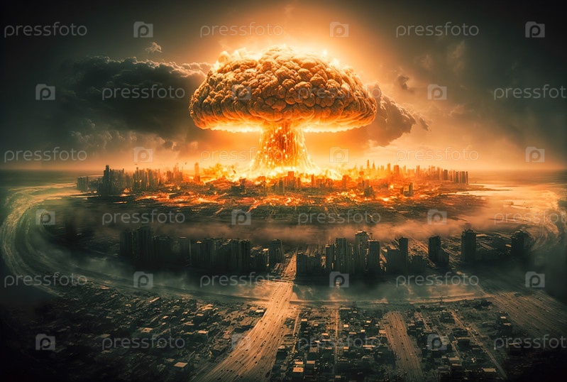 Ядерная бомбардировка мегаполиса на побережье океана. Начало апокалепсиса. Реалистичная цифровая иллюстрация