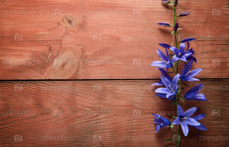 Голубые цветы колокольчика на деревенском деревянном фоне