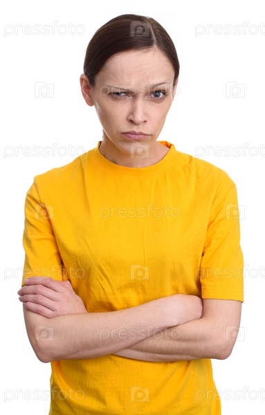 Злая женщина серьезно смотрит в камеру