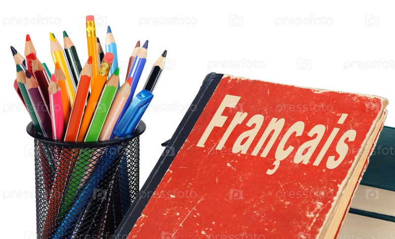 Изучайте французский язык, учебник и карандаши изолированы