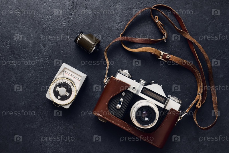 Старая ретро-камера и винтажный экспонометр на черном фоне, плоская планировка