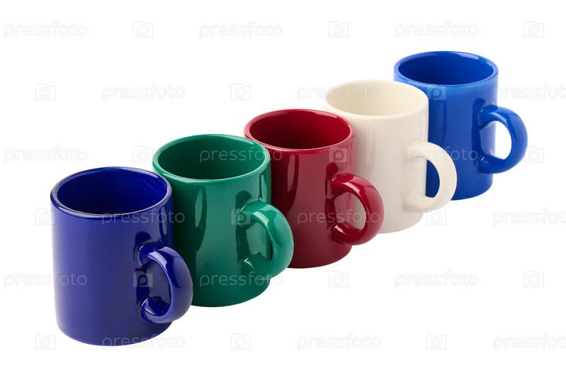 Разноцветные керамические кружки на белом фоне крупным планом