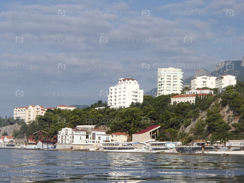 Вид со стороны моря на прибрежную зону, вдали возвышается Ай-Петри. Южный берег Крыма, Гаспра