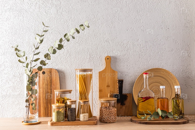 Концепция хранения продуктов на кухне. сыпучие продукты в стеклянных банках и разные виды масла в бутылках. передний план. серая цементная стена