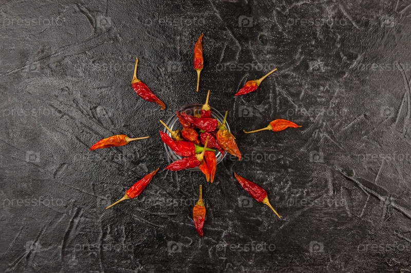 Сухой красный острый перец лежит на черном фоне