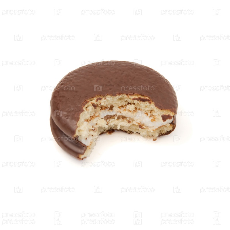 Кусок шоколадного торта chokopie, съеденный на белом фоне в перспективе