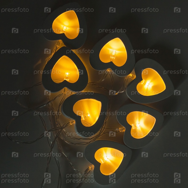 Гирлянда в виде сердечек сияет ярко-желтым светом. Концепция для всех влюбленных