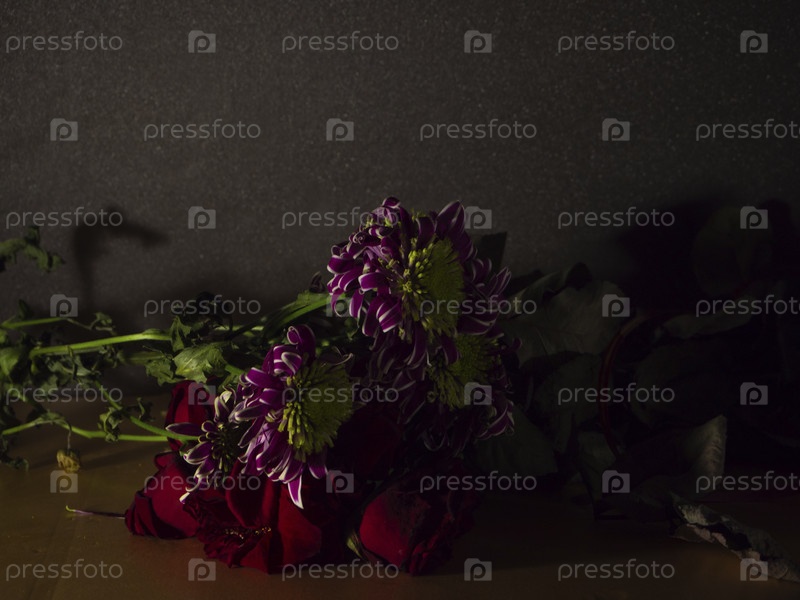 Увядшие и бесполезные цветы хризантем и роз лежат в куче друг на друге