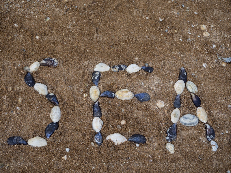 Крупный план надписи на пляже-море. На морском песчано-ракушниковом пляже текст выложен ракушками. Знаки и символы