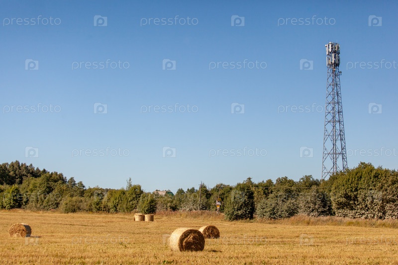 Вышка рядом с полем, сеном и лесом