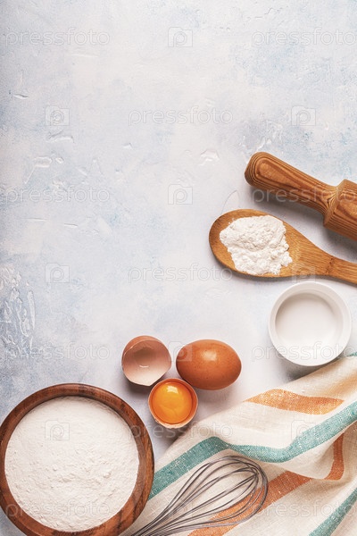 Ингредиенты для выпечки - мука, деревянная ложка, яйца