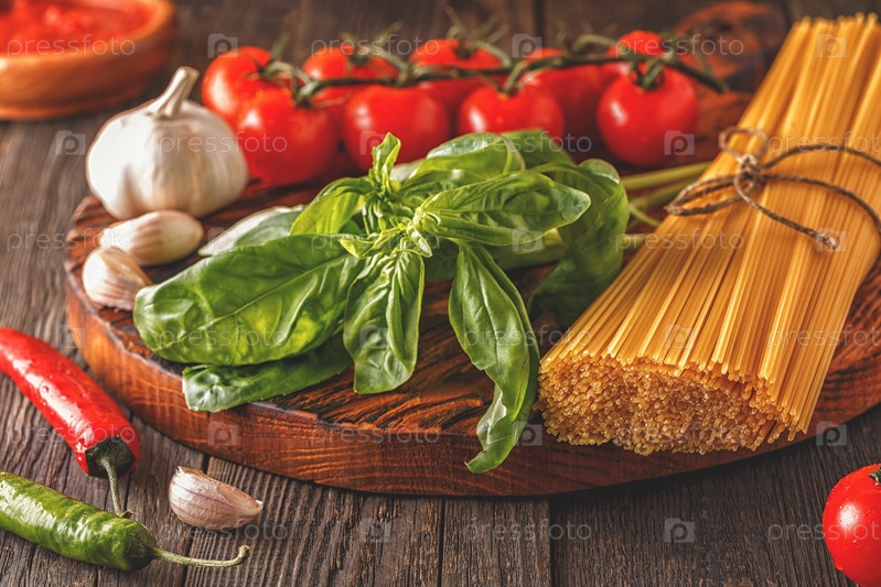 Продукты для приготовления пищи - макароны, помидоры, чеснок, перец и базилик