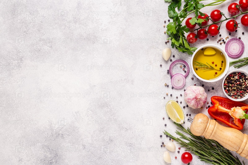 Травы и приправы на светлом каменном фоне