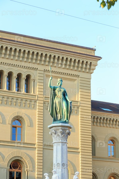 Берн, Швейцария. Фонтан Бернабруннен венчает бернская фигура. Создатель скульптор Рафаэль Кристен (1811 - 1880)