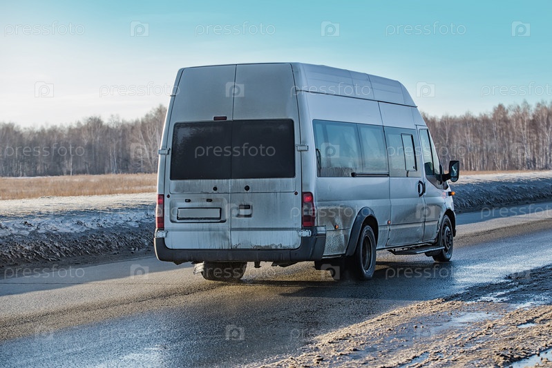 Микроавтобус идет по зимнему шоссе