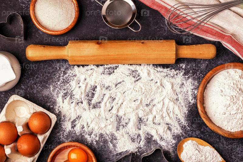Ингредиенты для выпечки - мука, деревянная ложка, скалка, яйца