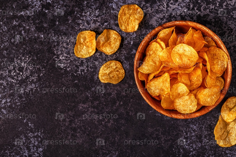 Хрустящие картофельные чипсы в миске на каменном фоне