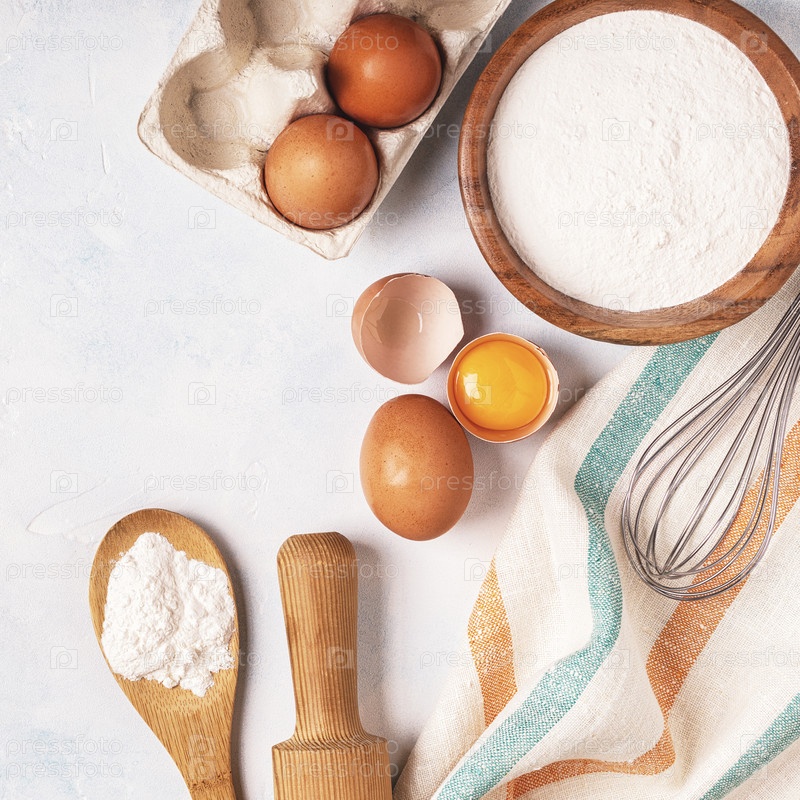 Ингредиенты для выпечки - мука, деревянная ложка, яйца