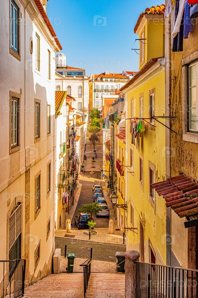 Узкая, аутентичная улица Лиссабона, Португалии