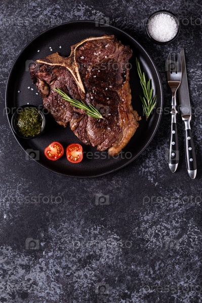 Стейк из говядины на гриле со специями на черной тарелке