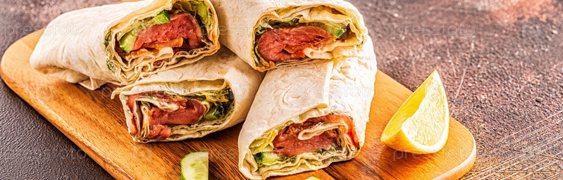 Завернутый сэндвич с лососем, листьями салата, огурцом и сливочным сыром