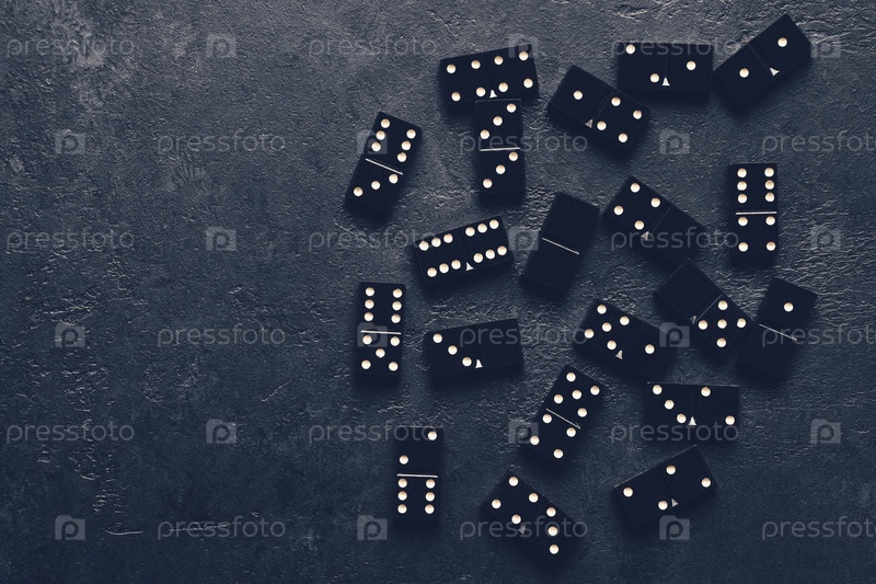 Старые черные фишки домино разбросаны по столу в винтажном стиле