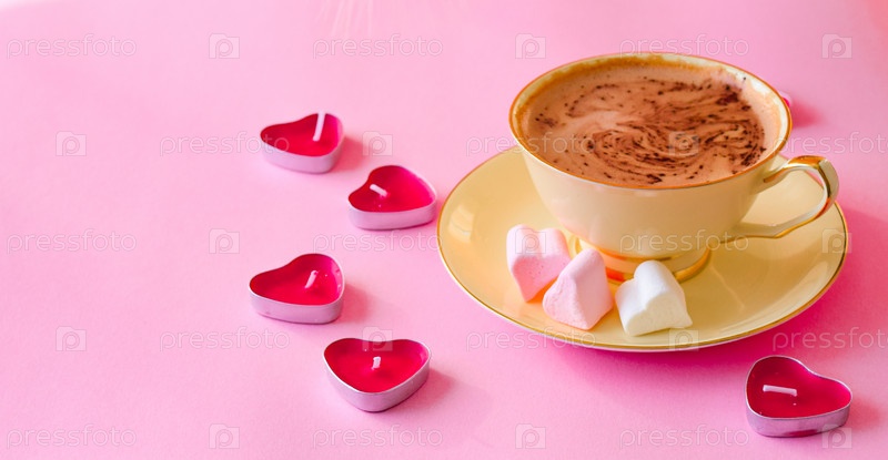 Элегантная бежевая чайная пара, кофе налит в чашку. На блюдце три зефира в форме сердца белого и розового цвета. Вокруг красные свечи в форме сердца. Розовый фон