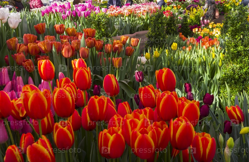 Яркие разноцветные тюльпаны. Фокус на среднем плане. Традичионная ежегодная выставка "Репетиция весны" в в Аптекарском Огороде (филиал ботанического сада МГУ). Москва