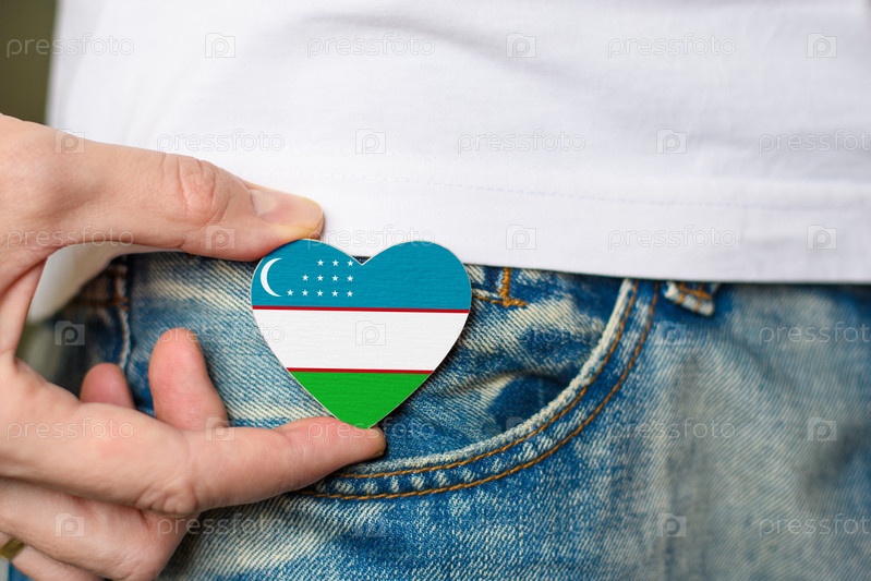 Житель Узбекистана. Деревянный значок с флагом Узбекистана в форме сердца в мужской руке