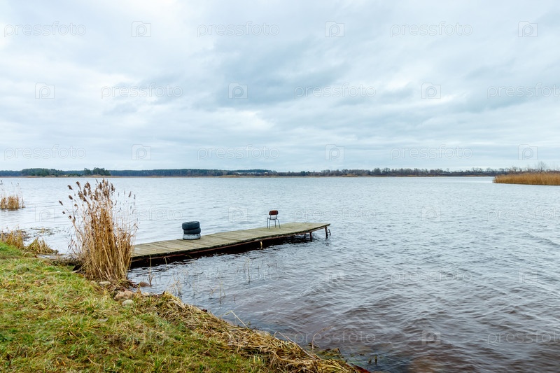 Идиллический вид на деревянный пирс в озере с облачным небом