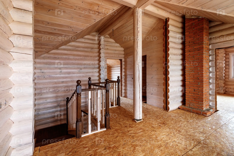 Двухэтажный деревянный коттедж изнутри в хвойно-еловом сосновом бору