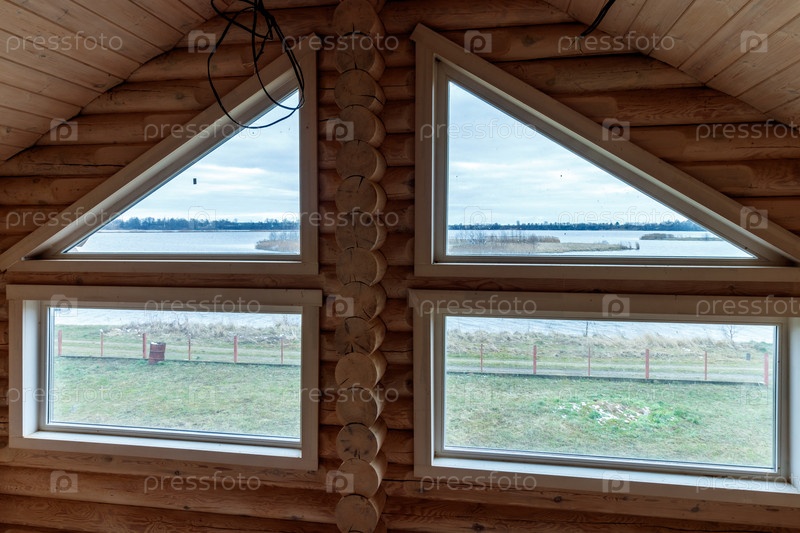 Двухэтажный деревянный коттедж изнутри в хвойно-еловом сосновом бору. Удивительный душераздирающий вид из панорамного большого окна дачного загородного дома