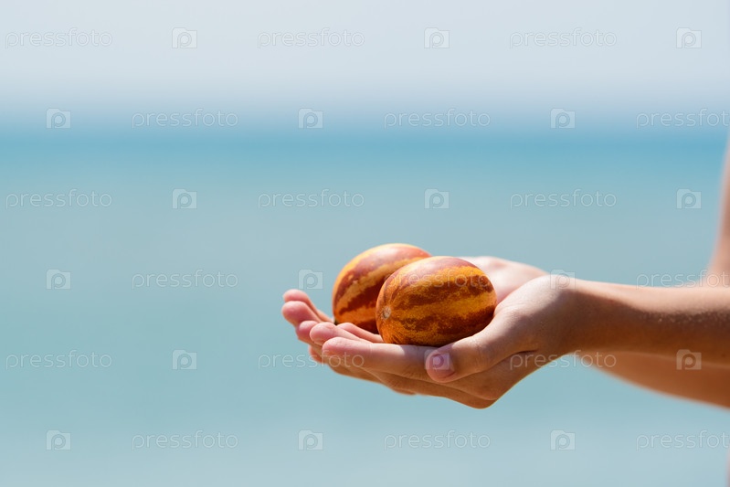 Две маленькие полосатые дыни лежат в руках на фоне синего моря