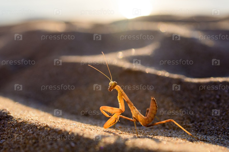 Богомол сидит на песчаном пляже. Время заката. Богомол смотрит в камеру