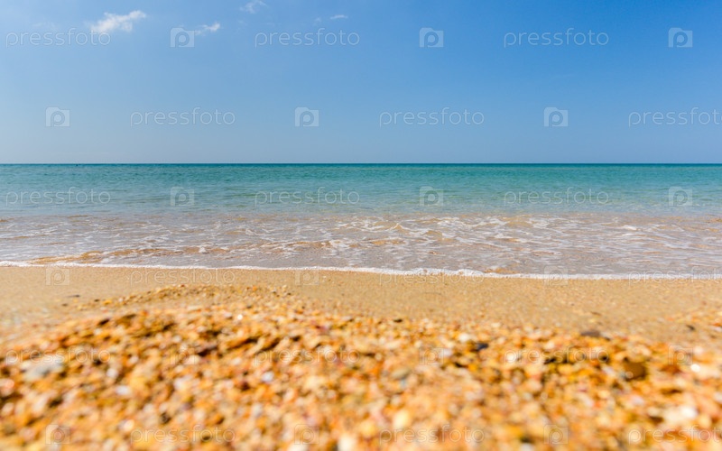 Синее море и ракушечный пляж. Сосредоточьтесь на море, пляж размыт. Красивое море
