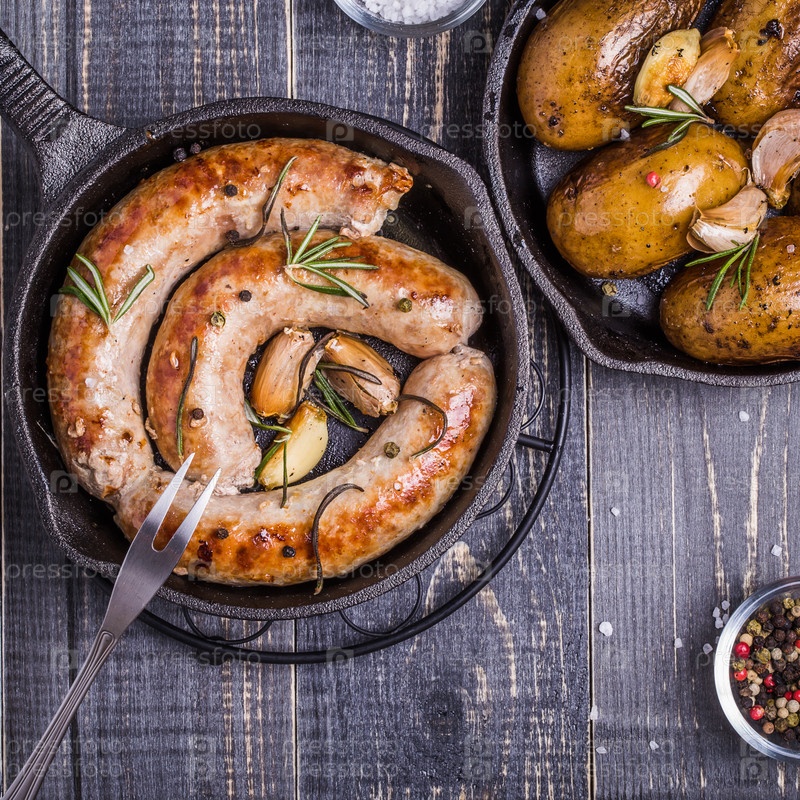 Картофель в деревенском стиле и жареные колбасы