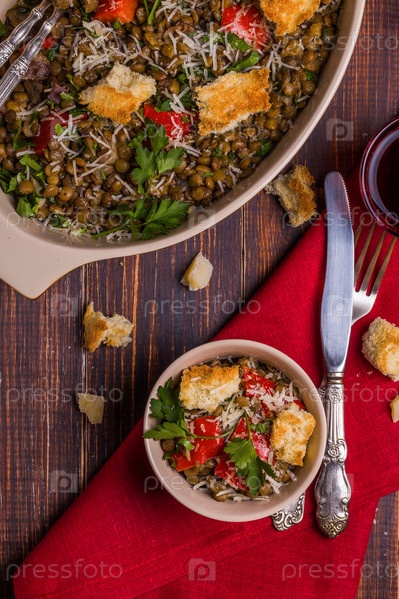 Чечевица тушеная с беконом, перцем и гренками