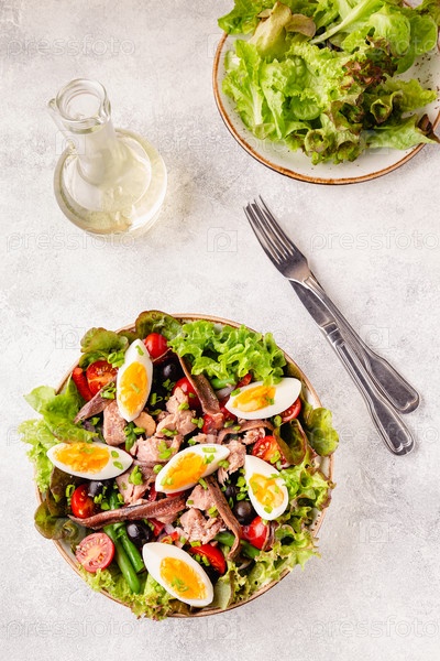 Салат Нисуаз с тунцом, яйцами, стручковой фасолью, помидорами, оливками, листьями салата и анчоусами