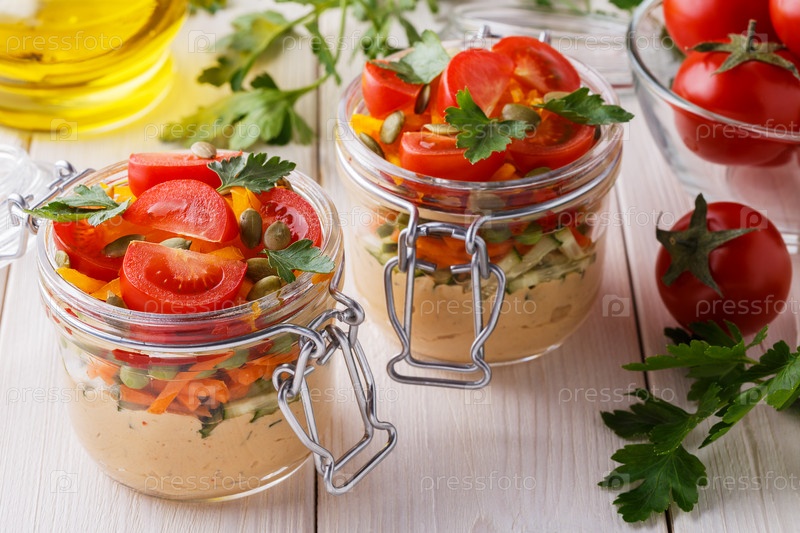 Здоровый завтрак - хумус с овощами в стеклянных банках