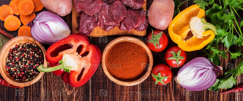 Ингредиенты для приготовления гуляша или тушеного мяса: сырое мясо, травы, специи, овощи на темном деревянном фоне
