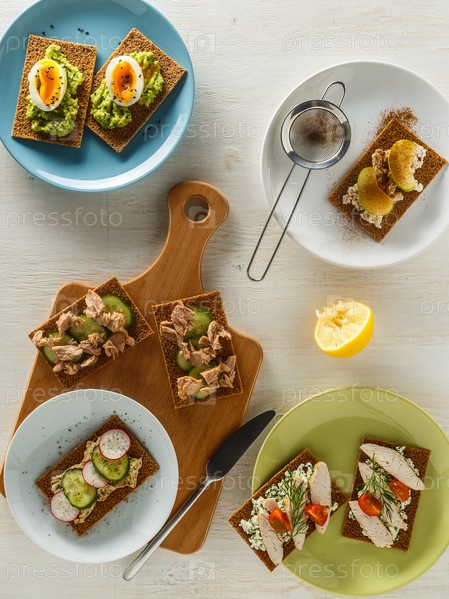 Здоровые бутерброды с различными начинками на хрустящем ржаном хлебе