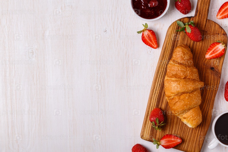 Завтрак с круассаном, джемом, фруктами и кофе