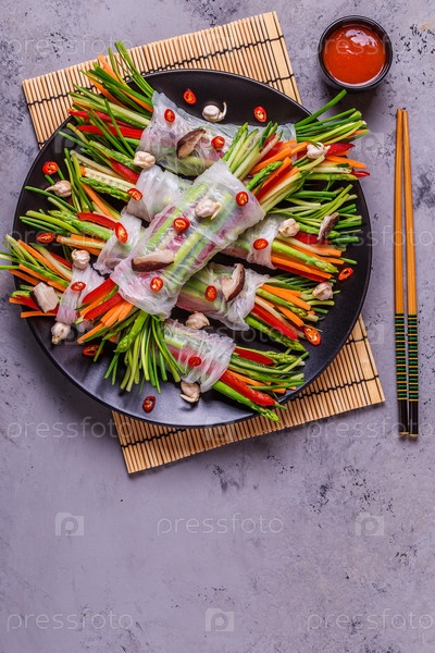 Спринг-роллы с овощами и грибами шиитаке на тарелке