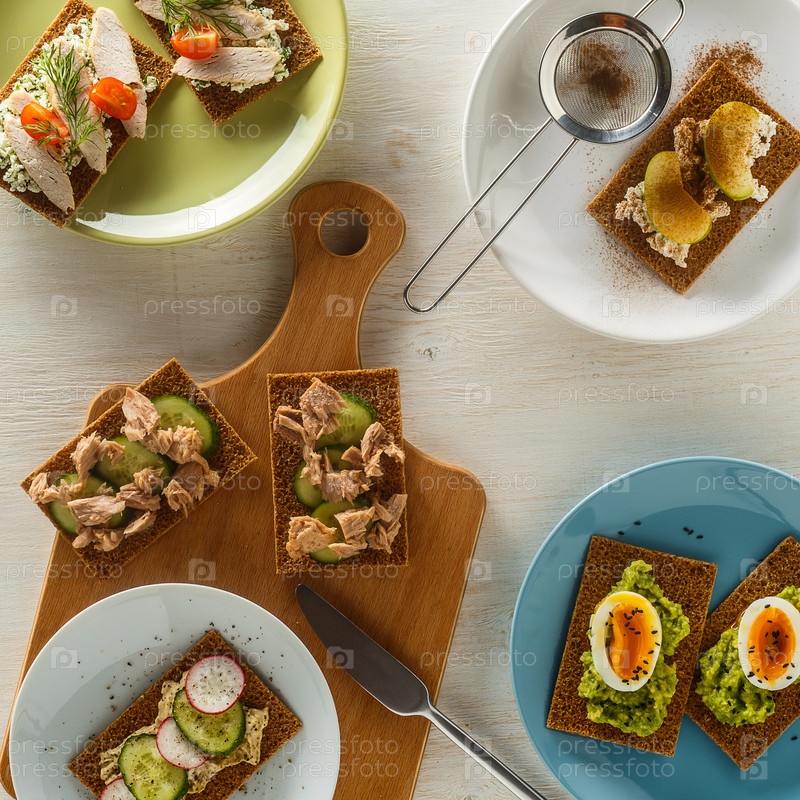 Здоровые бутерброды с различными начинками на хрустящем ржаном хлебе