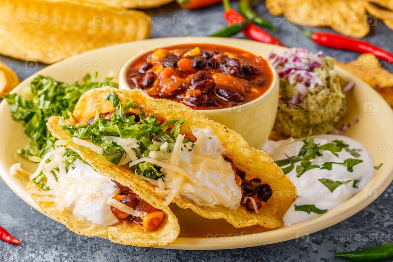 Тако с чили кон карне, салатом, сыром и сметаной