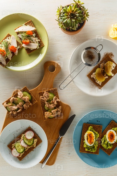 Здоровые бутерброды с различными начинками на хрустящем ржаном хлебе