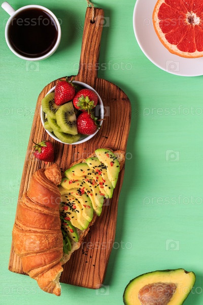 Вкусный завтрак - круассан с авокадо, фруктами и кофе